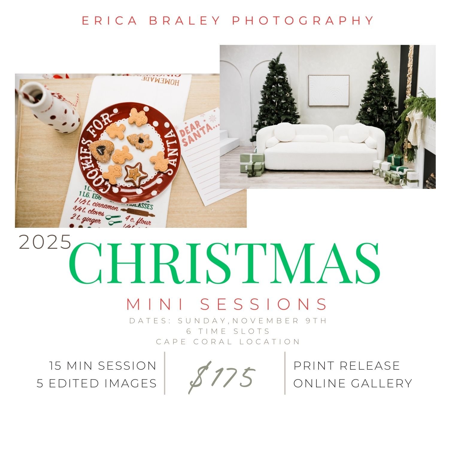 Christmas minis are in studio, located in Cape Coral 10-15 minute sessions and include 5 digital images of your choice $175 total, $50 retainer due at time of signing up No refunds Multiple setups will be available to use
